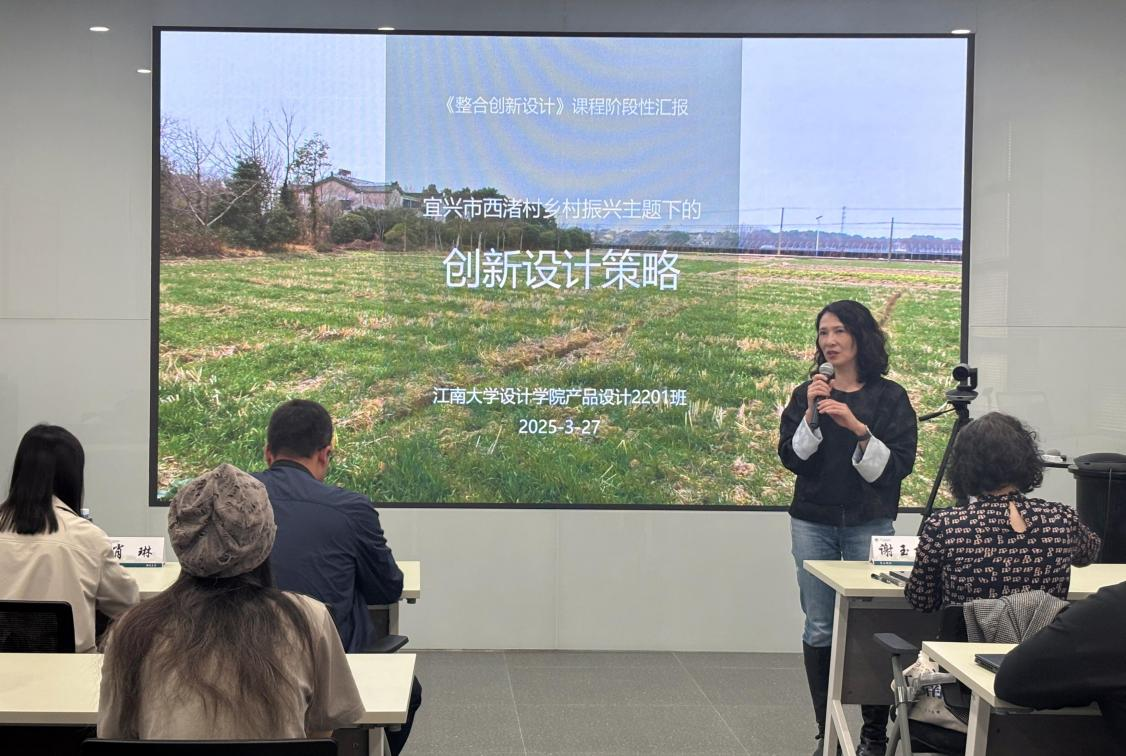 产品设计2201班《整合创新设计》课程中期汇报顺利举行。本次课程聚焦江苏宜兴市西渚村,以“设计赋能乡村振兴”为主题,借助在地调研与系统整合,深入探索城乡互动背景下设计介入乡村建设的有效路径。汇报由课程任课老师鲍懿喜教授主持,邀请商学院谢玉梅教授、法学院盖中辉老师与肖琳老师到场点评,西渚村党总支书记方忠、副主任祝辉、治保主任孔繁震等村干部以及樱花漫画