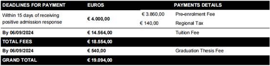 学费;在学习期间,需缴纳意大利新美术学院学费,2024学费(欧元)收费标准如下表: