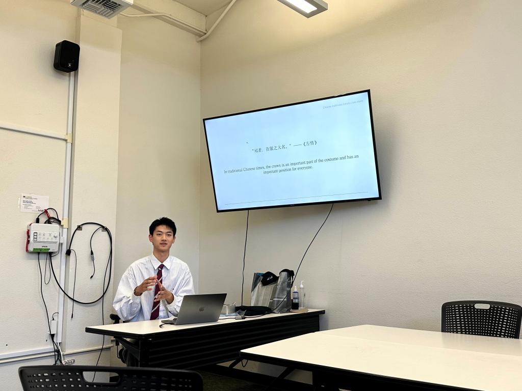 胡绮文、高祥、张译月和杨帆四位研究生分别介绍了各自的研究课题。胡绮文同学重点介绍了她对明代官迹图服饰的研究,高祥同学则分享了他对中国传统女性阶级冠饰的研究成果,张译月和杨帆则分别从史料分析与跨文化传播、中式景观园林的特点等方面阐述了她们的研究项目。