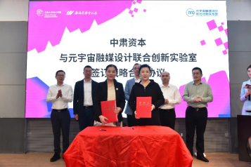 元宇宙融媒设计联合创新实验室与上海中肃创业投资管理有限公司签订战略合作协议。朱飞、肖彬、陈晓星、颜春水、王晓、周云龙、王维青见签。
