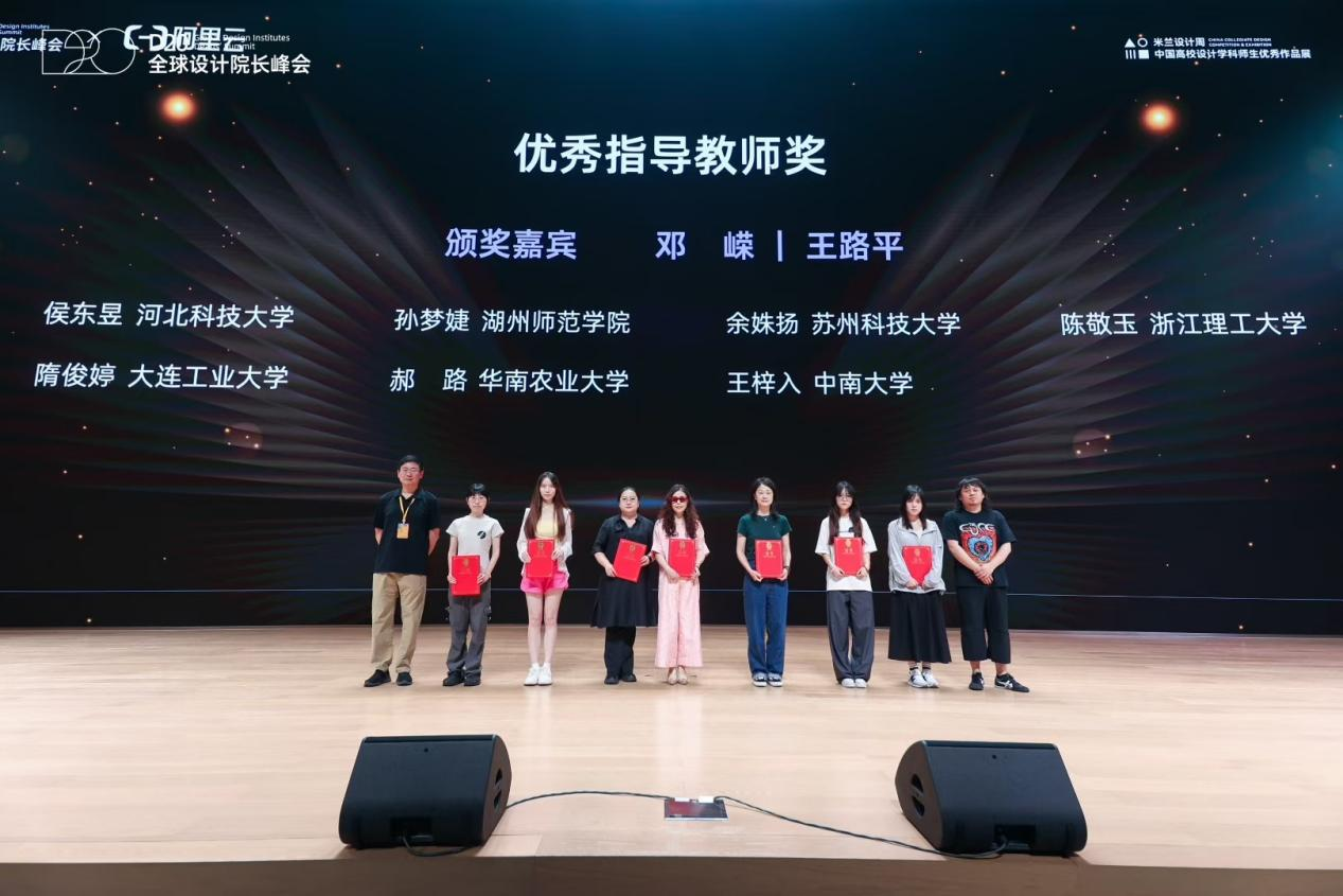 邓嵘教授参与组织策划“人工智能+设计”专项赛道,携手浙江理工大学等权威机构,率先在艺术设计教育领域探索AI+设计的融合创新。邓嵘教授受邀担任颁奖嘉宾,为获奖代表颁奖。