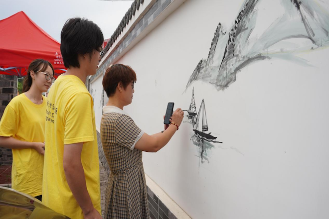 墙绘成果受到了当地驻村干部、村民的一致好评,不时引得行人注目观看,部分热心村民也在团队的邀请下参与墙绘共画。