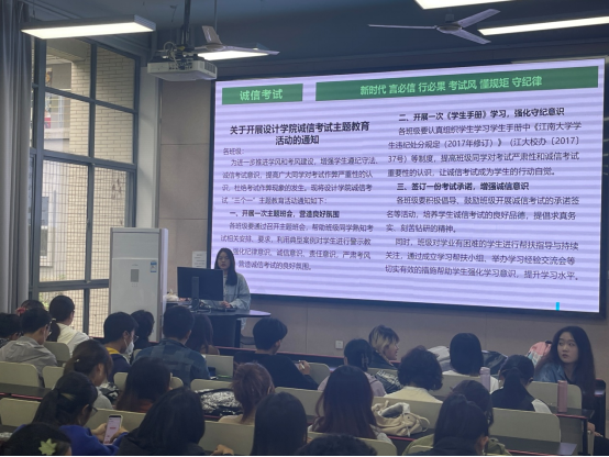 为使同学们深刻了解诚信考试的重要意义,积极响应学院关于开展诚信考试主题教育活动的号召,工设2201、工设2202班以及公艺2201、公艺2202班于5月30日晚在一教1A111教室召开诚信考试教育主题教育大会。本次大会由公艺2201班班长刘佳蕊主持,工设2201团支书周欣祎向同学们做了诚信考试ppt讲演,公艺2202团支书张晓雨带着大家就《学生手册》中考试违纪处罚规定进行学习。会后,各班级同学进行诚信考试承诺书统一签字仪式,对诚信考试做出郑重承诺。