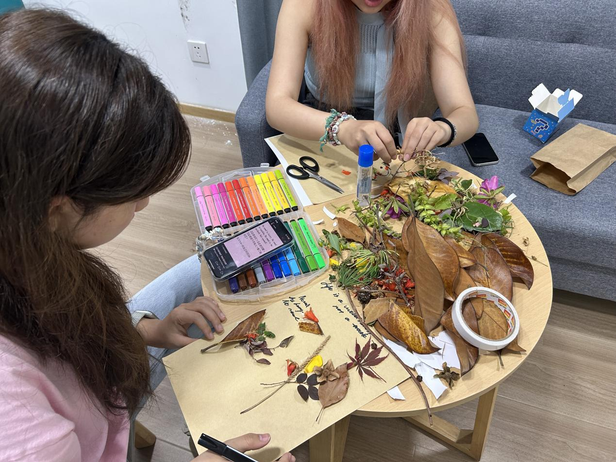 自然拼贴诗,表达当下心绪带着采集下来的自然材料和盲盒材料,进入“自然拼贴·情绪创作”环节。树叶、花瓣、石块与手写文字融合在一起,成为一张张充满感情的拼贴作品。拼贴不仅是一种创作,更是一种内在情绪的流动与释放。
