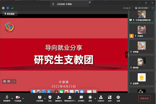 来自设硕2003班的牛思琪同学作为西部计划研究生支教团代表,曾在云南省保山市隆阳区芒宽民族中学担任支教老师。牛思琪从“初心”谈起,分享了自己当初为什么会选择担任支教老师。她为大家介绍了“西部计划”的网上报名、简历筛选、组织培训、省级面试等各个环节的注意事项,让同学们对“西部计划”有了更深刻更全面的了解。