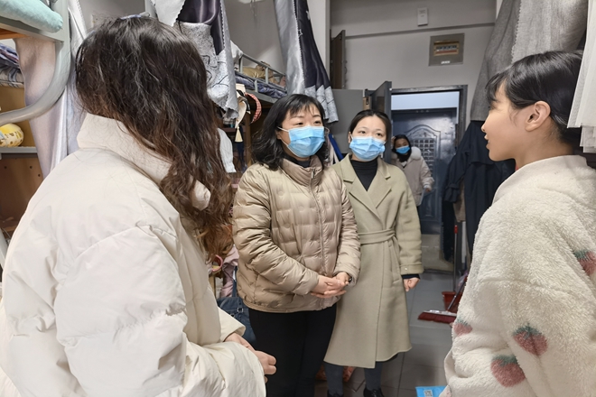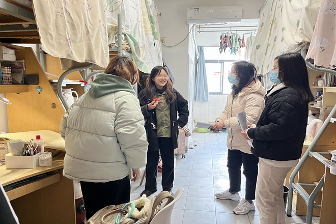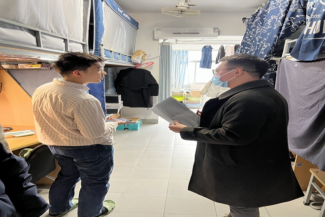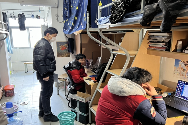 党委副书记王晖、学工办主任吴雨琛以及各年级辅导员前往学生宿舍,走访看望已返校在线上课学生。