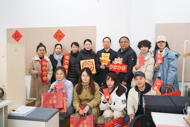党委书记邱建平、院长魏洁、党委副书记王晖和辅导员老师们悉心准备“红”礼包,包括“红”福、“红”包、“红”食,寓意鸿运当头,年味浓浓,将喜庆年味送进学生科研室和宿舍。
