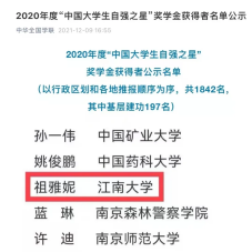 2020级研究生祖雅妮同学荣获“中国大学生自强之星”称号。