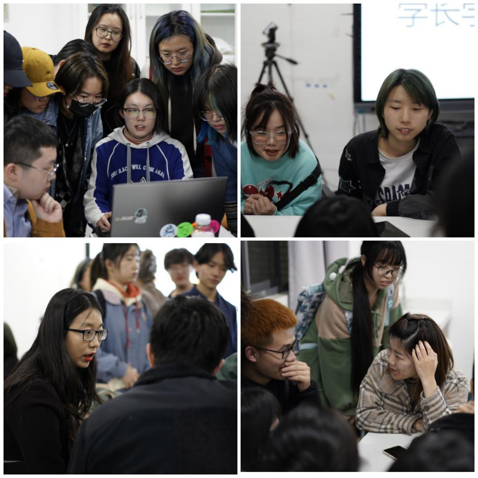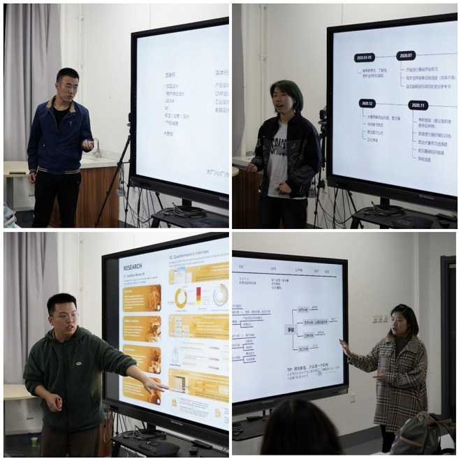 随后,优秀朋辈们开始分享。姚奕欣和王必亮同学分别展示了各自的作品集,分享了一份优秀作品集的结构、内容、版式以及制作技巧。孙滢涛同学则重点针对出国申请时间安排、学校挑选、申请流程等内容进行了分享。肖幸和杨雯同学从考研流程、时间、准备方面介绍了各自的经验,包括各科目的基本考试内容、复习要点、复习方法等。李承翼、徐子轩、史明伟同学分享了自己从准备作品集、投简历、笔试、面试的全流程经验,为大家梳理了求职过程中的关键节点和注意事项。其后,进入自由沟通环节,同学们就自己关心的问题,与嘉宾们进行了深入的交流,学长学姐们也基于自身的经验和体会进行了耐心解答,给出了相应的建议,为大三的学子们拨云见雾、引路指航。