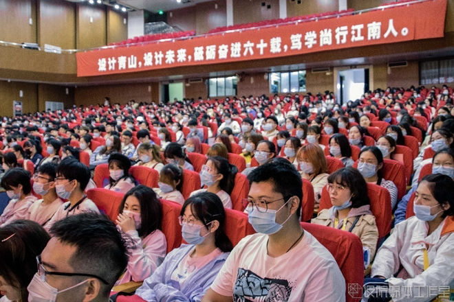 典礼仪式结束后,邱建平书记为全体新生讲授思政第一课。他围绕“深入学习党的十九大精神”、“战“疫”给我们的思考”和“设计青山,设计未来”这三个方面进行阐述。首先具体介绍了党的十九大会议主题相关内容及其精神内涵,并带领大家学习了习近平新时代中国特色社会主义思想的形成以及历史贡献;其后,结合战“疫”数据及其成果向同学们展示了中国精神、中国力量以及中国担当,充分体现了中国共产党的领导力,反映出了中国特色社会主义制度的显著优势。最后,围绕“我是谁”“我骄傲”“我设计”三个维度展开,他希望同学认真思考,紧密跟随“坚持中国特色社会主义教育发展道路,培养德智体美劳全面发展的社会主义建设者和接班人”的成才方向,做有理想、有担当的一代青年。他以4P方法即规划(plan)、实践(practice)、慧玩(play)、坚持(persist)和3D方法即梦想(dream)、坚持(duration)、卓越(distinction)的讲述提出了对同学们的要求,希望同学在樱花漫画