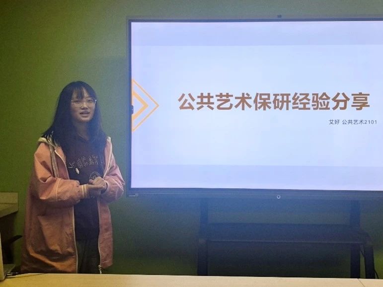 艾好学姐、刘一墨学长和尹若兮学姐从保研经验、学习方法、心态调整等不同方面慷慨相授,将他们的学习经验与心得不遗余力分享给大家。艾好学姐分享了保研经验,从保研基本知识,保研准备工作,保研注意事项三个方面展开叙述。她建议同学们要多参加竞赛,与专业课老师多进行交流,上课需要认真记录公共艺术专业的相关知识与国内外案例,培养审美。刘一墨学长从学习内容、向师长学习、掌握表现力等方面展开。分享了各类媒材艺术、空间与科技艺术、公共艺术策划,以及自己在各类作业与活动中丰富有趣的经历。突出了向师长学习的重要性,并且推荐了多个学习软件促进学习效率。最后提及心态平稳的重要性,只有心态稳定下来才能帮助我们走得更远。尹若兮学姐分享了自己的专业相关作品,拓展了竞赛相关的知识,通过公共艺术作品分享自己的想法与创意,针对不同的比赛分析了相关背景和目标人群,给同学们提供了了许多设计思路,详细讲述了自己的相关行动与经历和想法。同时她也强调了参加竞赛进行思路与想法的碰撞的重要性,并向大家推荐了社会创新设计等相关网络资料。