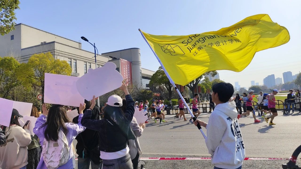 杨永俭老师带领美术学的同学们共同完成。整个彩绘分男女两个赛道,分别由两组奔跑的运动员形象组成,在运动员的旁边点缀樱花图案,体现了无锡马拉松“锡马画中跑,最是江南好”的理念,玫红色的主色调更体现了青春亮丽、运动的激情。