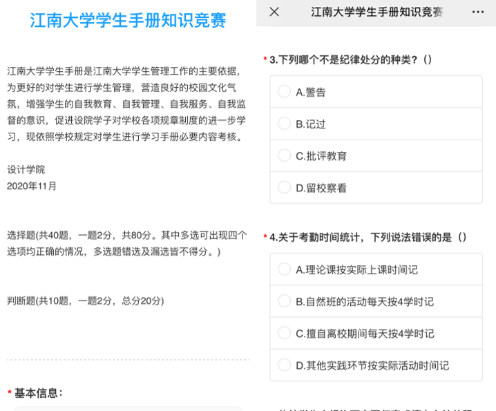 此次考试以闭卷的形式展开,通过问卷星进行测试,内容涵盖校纪校规、评奖评优、违纪处分等基本内容,通过单选、多选、判断等题型,考察新生对《学生手册》实际学习掌握的深入程度,本次考试涵盖2020级全体新生。考试过程中,同学们认真答题,监考人员尽职尽责,场内秩序井然。