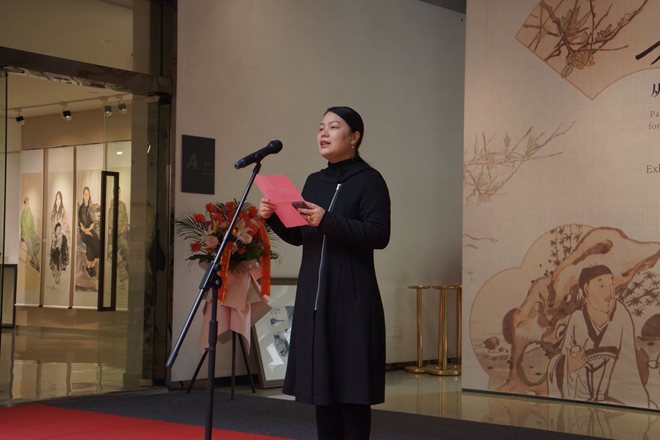 院长魏洁、无锡市美术家协会主席梁元分别致辞。魏洁院长代表学院向参加本次作品展开幕式的各界来宾表示热烈的欢迎,向悉心耕耘在教育田园的吴宇华老师表示感谢,对吴老师在高校美术教育与绘画创作工作中所取得的丰硕成果表示衷心的祝贺。魏院长在发言中期待吴宇华教授在艺术道路上继续不断求索,创作出更多的艺术佳作,为美术教育多作贡献。梁元主席代表无锡市美术家协会向吴宇华老师书画作品展的开幕表示祝贺,梁主席称赞吴老师多年来在绘画研究方面前行不懈,师法古人且融会创新,用笔墨体现了意趣高妙的审美意境,形成了自己鲜明的艺术风格,敦正清雅的品格让人赞佩,期冀他在笔墨线条的世界里勾勒出别样的精彩。之后,樱花漫画