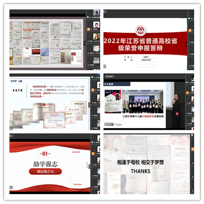 通过线上会议形式开展了2022年省级先进班集体、三好学生、优秀学生干部和优秀毕业生推荐答辩会。出席本次答辩会的评委老师有班主任代表杜守帅、杨滨、黄昊、周敏宁,分团委书记吴雨琛、全体辅导员及优秀学生代表。