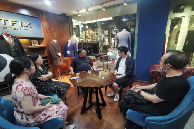 服装系校友马腾创办的一家提供男士服装定制的企业,马腾表示,近年来服装行业受互联网冲击,在销售渠道和销售理念上发生了比较大的转变,销售重心由线下门店逐步向线上直播销售转移,直播成了当下服装行业最主要的销售路径,这就对设计师提出了更高的要求。他强调,未来优秀的设计师一定是能够具备产品能力,销售能力和审美能力三合一的全方位优秀人才。
