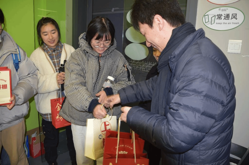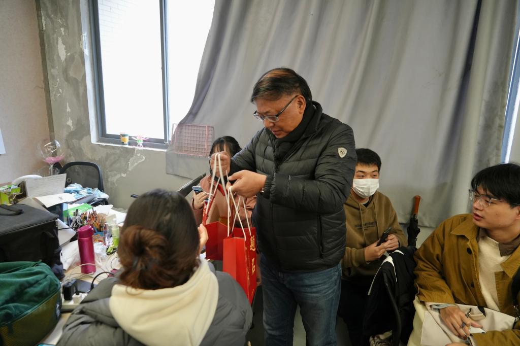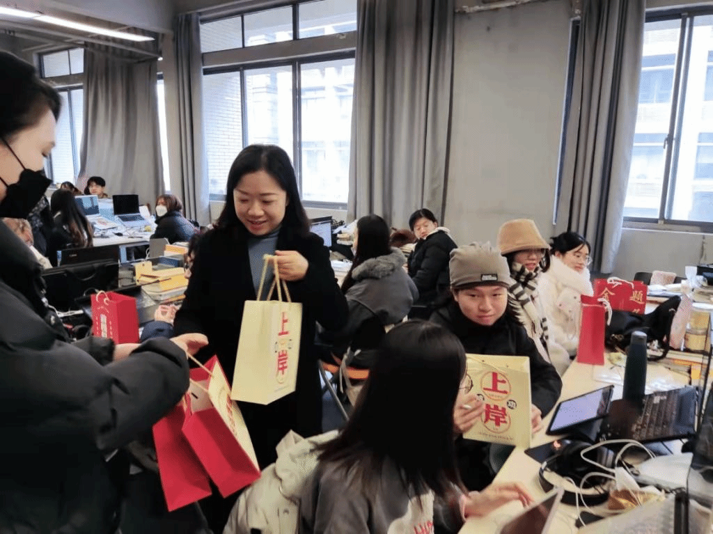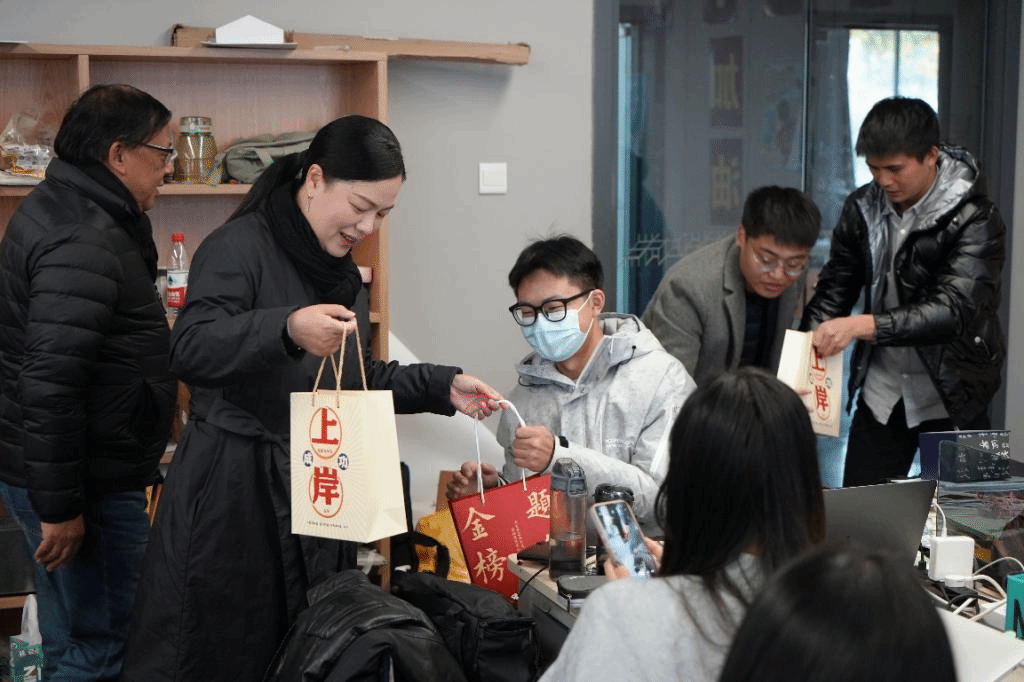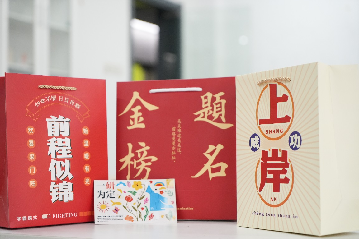 随后,学院党政领导班子为考研学生送上精心准备的“考研大礼包”:“金榜题名”袋 、“牛气冲天”奶、“心想事成”橙、“一‘研’为定”卡,寓意深刻,沉甸甸的礼包承载了学院对考研学子满满的祝福和诚挚的期望。 工设1902班周欣亚同学表示,学院对于考研学子这样热情的问候、暖心的关怀,让备战考研的学子真切感受到了来自学校的关爱与期望,给予了学子信心与力量。服工1901班张田田同学表示,对于学院的慰问活动,每个考研学子心中都倍感温馨,感受到了关心与重视,很大程度上舒缓了自己的心理压力,接下来会继续以饱满的热情投入复习。
