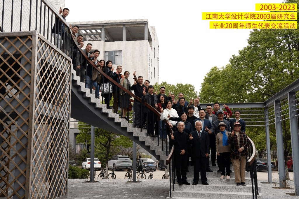 和设计馆,了解二十年来学院的发展历程和动态,被母校所取得进步所鼓舞,为学院最新的成就而自豪。莘莘学子,心系母校,不管校友们离开多久,距离多远,母校是大家事业的起点,扬帆起航的港湾。二十年后再回母港,校友师生们先一起在打卡地标“旋转楼梯”上合影留念,从空间构成中感受当年造型楼的场景。