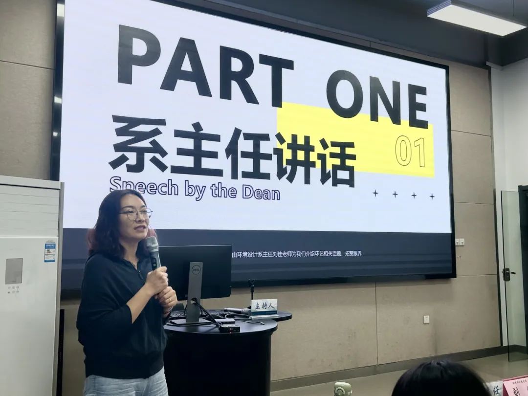系主任刘佳老师首先致辞,她结合自身与以往学生们的学习经历,解答了环艺同学们关注的专业前景、未来规划、个人发展等问题,表达了对同学们的真心关怀和殷切希望,鼓励同学们要有前瞻性的眼光,要有对专业的热爱和信心,努力提升专业能力和综合素养。