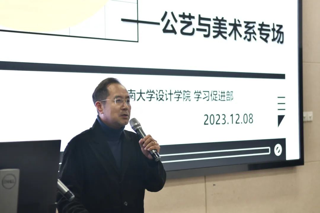 系主任赵昆伦老师从考研升学选择方向以及必要性、就业建议、公共艺术在未来大概的发展方向、本科阶段应该准备什么、学科竞赛等方面进行答疑,他指出公共艺术与数字化技术相结合的概念、工艺术语品牌设计、公共艺术与社会需求的结合以及公共艺术在空间中的技术融合是值得关注的方向。他认为对于学生来说需要与老师进行沟通,了解课程设置和方向,明确自己的兴趣和目标。学习美术的过程中要通过提高自己的学术思考能力和文化素养的积累,以及落实具体的技能。