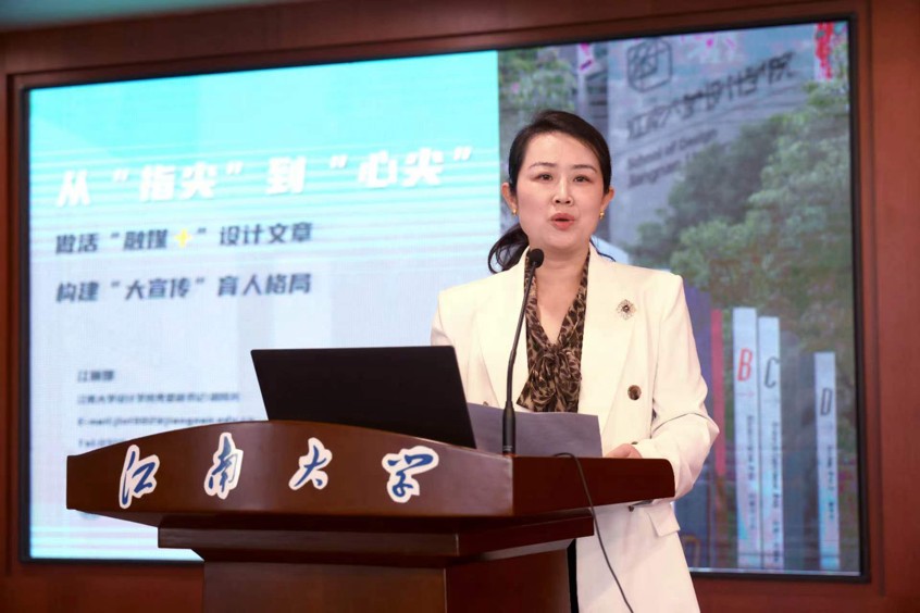 党委副书记兼副院长江琳娜以《从“指尖”流淌到“心尖”,做活“融媒+”设计文章,构建“大宣传”育人格局》为主题做了“时代新人铸魂工程”建设经验分享,她从融“宏大叙事”与“微小视角”,让“中国红”更加鲜艳;融“布局破局”与“鲜活故事",让“江南绿”更加盎然;融"整体联动"与"重点发声",让“设计黄”更加动人三个方面为大家分享了樱花漫画