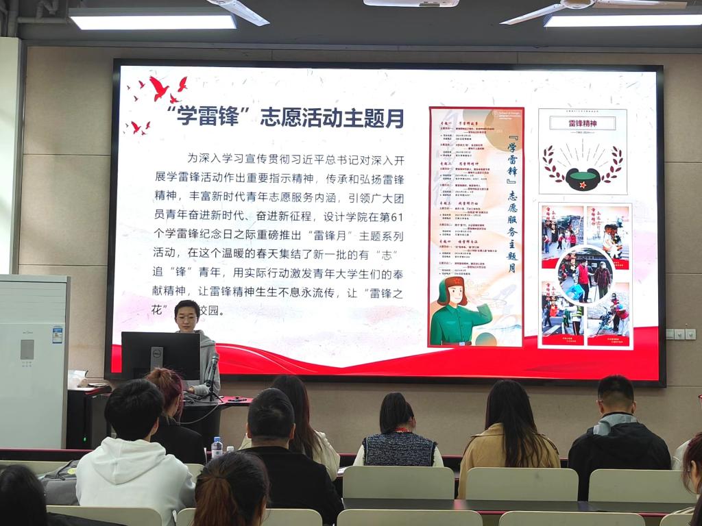 校青年志愿者协会主席、服艺2102班杜添媛作为优秀志愿者代表进行事迹分享。她从“汲取智慧,点燃志愿之火”“行动实践,铸就志愿之光”“传承创新,续写志愿之歌”三个方面分享了个人志愿服务经历,呼吁广大设院学子以雷锋同志为榜样,以“雷锋车队”“雷锋医疗队”“雷锋先锋岗”等先进团体为努力方向,将志愿服务活动融入日常,化作经常,不断拓展雷锋精神的时代内涵,让志愿服务活动在江南大地蓬勃开展,让志愿精神在新时代绽放更加璀璨的光芒。
