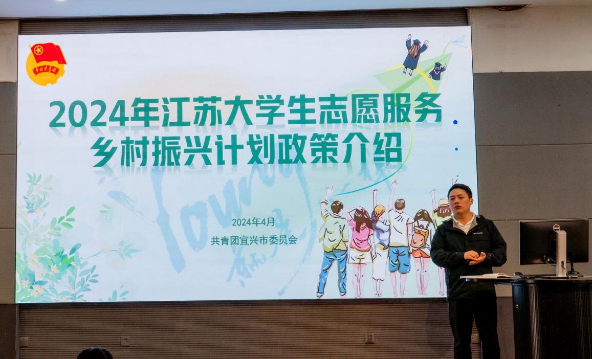 随后,无锡市宜兴团市委副书记熊中人、宜兴市大学生“志愿服务乡村振兴计划”志愿服务队团支部书记黄辰昳作了宜兴市“乡村振兴计划”招募政策宣讲。黄书记用宜兴宣传片作为开头,以大学生、外国友人等不同视角来看待宜兴,介绍这座包容细心的魅力之城。熊书记则重点介绍了宜兴志愿服务乡村振兴计划的具体流程要求、福利待遇及岗位。在宣讲最后,熊中人代表宜兴市向江南学子发出了诚挚的邀约,希望江大青年能与宜兴实现最美好的双向奔赴。