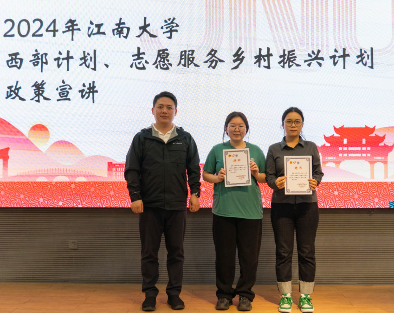 接着,王彤彤、张雅杰依次进行了“志愿归来话成长”我的青春故事宣讲。王彤彤结合自身经历从西部计划的服务范围、工作内容、心得感受等方面作了详细介绍,号召同学们积极报名西部计划,到祖国和人民最需要的地方去,为助力西部发展、乡村振兴战略注入“江南力量”。接着,张雅洁同学分享了自己在宜兴湖父村的志愿经历。她以最平凡的视角,分享了她通勤时的天空、工作单位的小猫、住宿区的馄饨......从这些平凡小事中向学弟学妹们散播她在志愿服务时所获得的能量,引人向往。通过这些生动的宣讲,设院学子深刻认识到“两项计划”的独特意义和重要优势。报告尾声,熊中人先生为两位志愿者颁发了“校地定向”宣传大使聘书并合影留念。