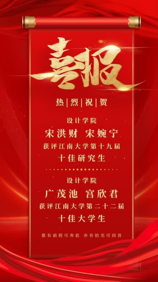 广茂池、宫欣君同学荣获“十佳大学生”荣誉称号;宋洪财、宋婉宁同学获得“十佳研究生”荣誉称号。