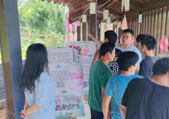 8月14日上午,烈日当空,“相约‘梅’好”实践团成员们顶着34℃的高温天气在古竹诗廊中布置展览,利用诗廊得天独厚的蜿蜒设计将展板错落摆放,与当地特产、扎染作品、与文创周边实物相得益彰。粉色的扎染布料悬挂在鱼鳞般的瓦片下,阳光透过长廊外的竹子缝隙中洒下,照在美丽的扎染布料上,微风拂过,竹影若隐若现,为整座长廊增添了一份别样的意境。下午,“杨梅古韵”展览正式开始,展览分为“古竹时光”“杨‘梅’吐气”“扎染生花”“文创周边”四个主题。一走进长廊,好似穿越到了一个由古竹文化与艺术创意编织的梦幻世界,每一块展板都是一处充满奇思妙想的空间,有无数美妙的惊喜等待发现。这一创意长廊也吸引了很多居民和小孩子,实践团成员们生动形象地讲解了古竹的历史、杨梅文化与扎染艺术的力量,分享了扎染过程中的趣事,其中,以天然竹林为背景的杨梅打卡区吸引了大家的驻足拍照。“哇,真的好美呀”、“今天真的学到了不少知识”“谢谢樱花漫画