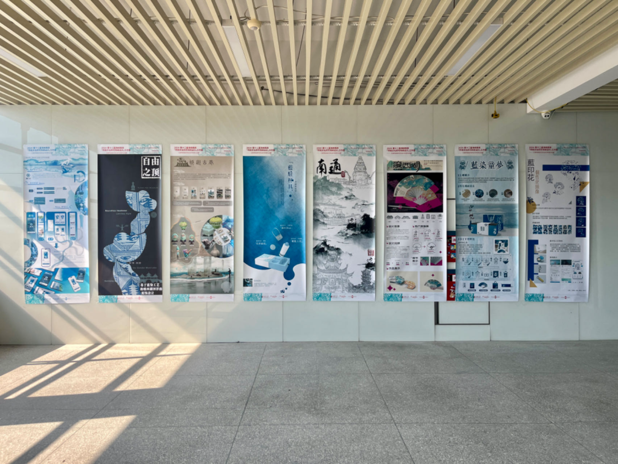 第一组的主题为“蓝染童梦”。作品以蓝染技艺为基础,设计创造蓝印花布自制体验包,组员们希望通过这个体验包,可以引发两岸的文化公民,引领新一代的年轻人传承传统技艺。第二组的主题为“蓝回”。设计基于蓝染的旧衣回收进行UI设计,在这个过程中组员们将传统服饰水田衣与设计结合,针对不同客户群体进行个性设计,有效地将传统文化与现代技艺精妙融合。第三组的主题为“水墨江北”。组员们希望通过江苏南部与江苏北部的文化差异和碰撞,更好地传承民俗文化。他们以采风城市---南通为设计背景,用南通城市logo为印章灵感,结合南通当地传统建筑为蓝本进行创作,对文创产品进行设计。第四组的主题为“自由之顶”。组员们以蓝印花布为基础进行帽饰设计,希望通过此次设计可以将传统文化与现代设计相结合,给客户提供更高质量及个性化定制。第五组的主题为“城巡古巷”。基于大运河博物馆为创作背景,进行博物馆展厅的游戏体验设计。可以帮助参观博物馆的游客们增加与场馆的互动性。在展馆中不仅可以游戏解密获得礼品,可以更好找到队友,定位实时位置。第六组的主题为“‘蓝’驻杯具”。组员们希望设计可以贴近年轻客户群体,将谐音梗、蓝印花布、水杯三者结合。互联网时代,一句诙谐幽默的谐音梗标语可以迅速抓取消费者的注意力,增加用户黏合度。以“‘蓝’住杯具,幸福就来惹”为slogan,既能体现产品特色,又不失幽默氛围。第七组的主题为“瘦西湖文创设计”。组员们首先介绍了设计背景和灵感来源,随后展示了他们设计的用户旅程图,游客们可以通过参与打卡获得礼物,而后展示他们的最终成品,将瘦西湖建筑与扇子进行结合。第八组以蓝印花为灵感,进行个性头像设计创作。组员们通过分析蓝印花的特点和工艺,带入年轻族群的视角进行创作,充满创意和趣味。
