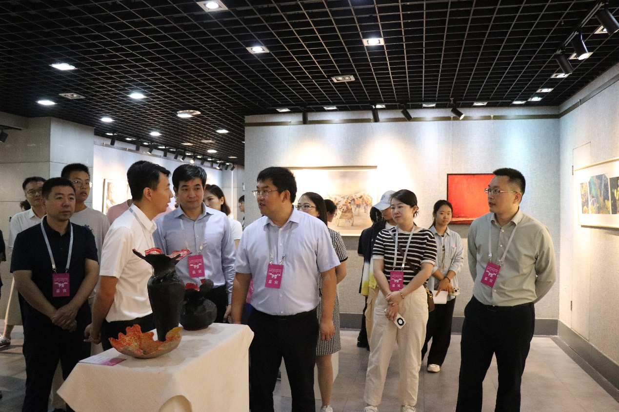 最后长三角设计学科党建高校联盟各高校成员参观“七十五载风华颂,墨启创设新征程”——庆祝新中国成立75周年师生作品巡展,本次巡展是长三角设计学科党建高校联盟单位落实“党建+美育”的生动实践。活动以反映时代风貌、彰显时代精神为创作指向,共征集长三角地区10所高校艺术与设计学科师生创作的书画、摄影、动漫、文创及雕塑等门类艺术作品130余件,其中樱花漫画