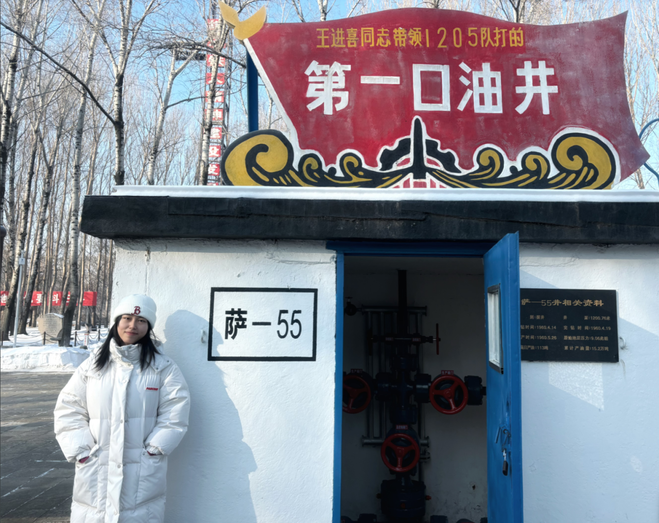 实践团成员参观了大庆油田历史陈列馆、大庆市第一口井旧址、王进喜纪念馆、大庆油田勘探开发研究院,通过回眸大庆油田60多年发展峥嵘岁月,感悟从铁人王进喜,到“新时期铁人”王进民,再到“大庆新铁人”李新民一代代大庆油田工业人自力更生、爱国敬业、艰苦奋斗、无私奉献等丰富的精神面貌。在参观过程中实践团了解到一直以来大庆市在人才培育过程中都将大庆精神、铁人精神作为引进人才培训的重要学习内容之一,加强对人才的政治引领和政治吸纳。“新时期大庆青年科技工作者扎根大庆的事迹不仅让我增强了精神认同、价值认同、情感认同,也让我不断反思自己的学习和生活,面对困难时,是否也能像他们一样,不轻言放弃,以积极的态度去寻找解决问题的方法。”马湘在这些天的调研走访中一直深有体会地思考着。