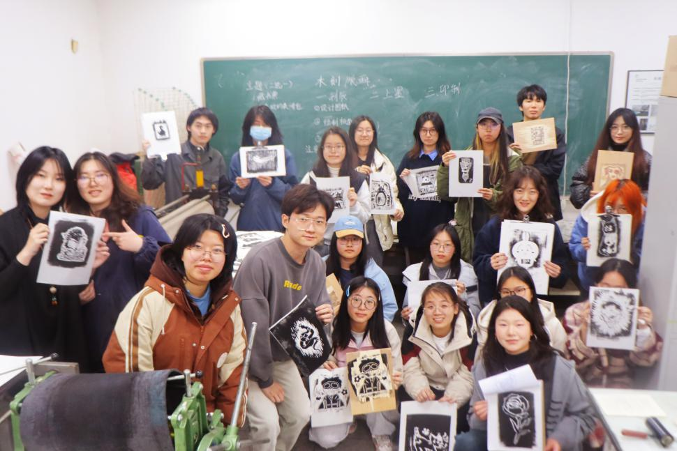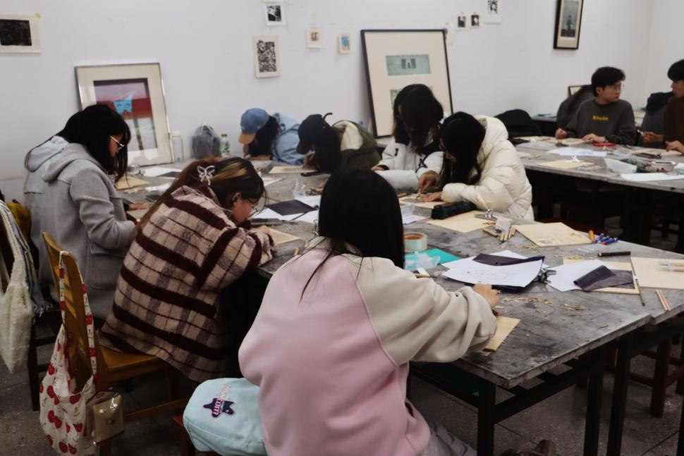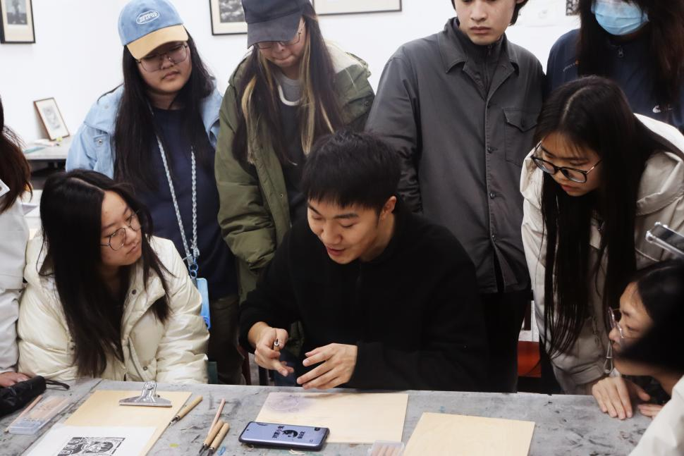 紧接着,美术专业2101班的曹数学长现场展示了版画创作全过程。他手中的刻刀犹如灵动的画笔,在木板上翩翩起舞,不一会儿,一幅精美的作品便在木板下完美呈现。同学们围在学长身边,全神贯注,不放过聆听任何一个关键步骤,现场气氛热烈而融洽。
