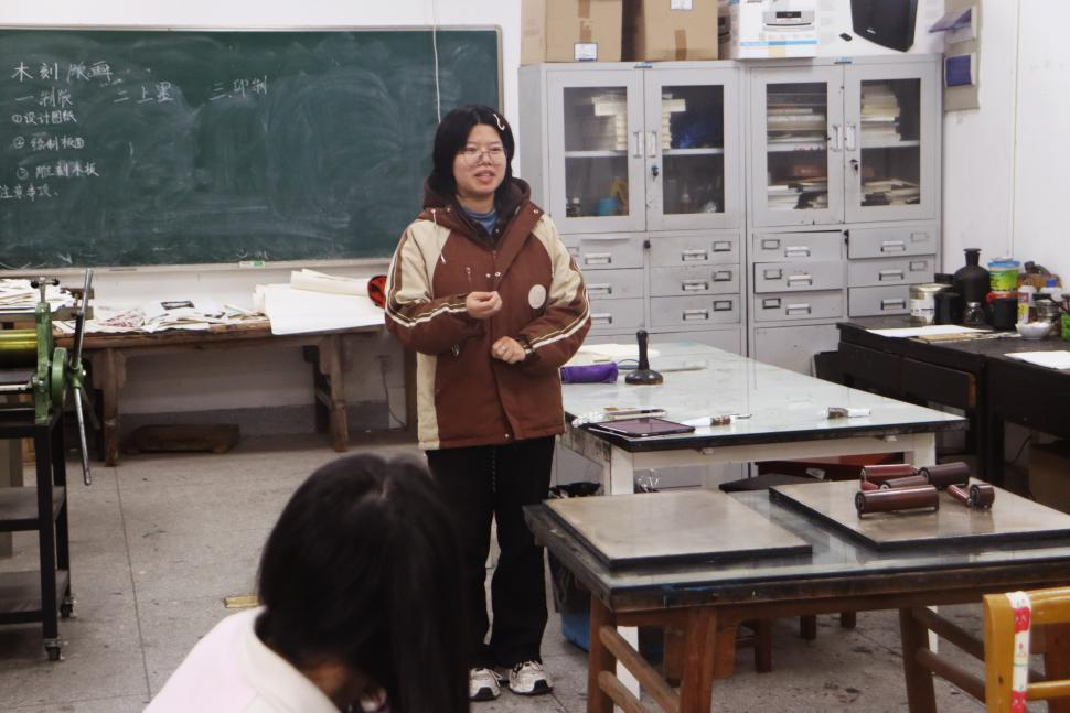 美术专业2202班的胡萱琦学姐化身知识使者,为大家详细介绍了版画的种类,带同学们认识了版画教室的各种工具,并耐心讲解各类版画工具的使用方法。在实物演示中,大家对版画艺术有了初步的认知,好奇与期待在心底悄然滋生。
