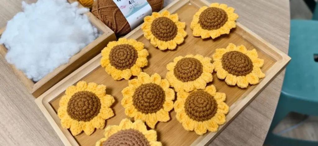 的同学们走进这个充满故事的工坊,用设计的力量为这份温暖增添新的色彩。在今年的考试季,工坊开展了一场特别的"一举夺葵"针织活动。在华亚萍老师的悉心指导下,奶奶们将复杂的花瓣针法化繁为简,一朵朵向阳而生的针织向日葵在指尖绽放。"没想到我们老人家的手艺还能接订单!"奶奶们骄傲地说。从学习到量产,这些向日葵不仅承载着祝福,更让奶奶们收获了被市场认可的喜悦。如今,标准化生产流程已在工坊落地生根,成为"老有所为"的最佳注解。