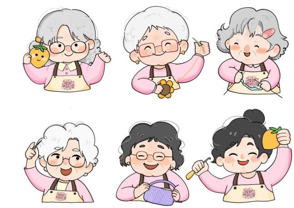 实践团为粉红奶奶工坊设计的一组IP形象,以六位可爱奶奶形象呈现。灵感来源于粉红奶奶们的互动,有的奶奶专注于手头的针线活;有的奶奶互相交流心得,彼此学习互相精进技巧;有的奶奶不仅完成了自己的工作,还热心帮助其他奶奶,大家都乐在其中,传递温暖、活力与手工劳作氛围,凸显工坊温馨、创意及老年群体积极生活状态,用萌趣设计拉近与大众距离,诠释工坊独特定位 。