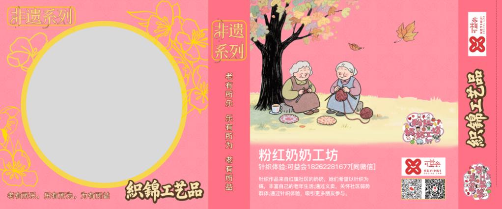 此外,实践团还为奶奶们设计了产品包装,其中艾草锤包装以柔和粉色为主,搭配圆点图案,融入奶奶形象传递温暖。织锦工艺品包装以粉红为主色调传递温暖,非遗系列定位凸显价值,画面呈现奶奶们针织场景,呼应“老有所乐” ,融入公益信息,借温馨设计,展现老年针织力量,传递帮扶善意,吸引关注,助力公益传播 。针织工艺品包装设计以粉白配色为主,卡头展示粉红奶奶志愿标语:老有所乐,乐有所为,为有所益。