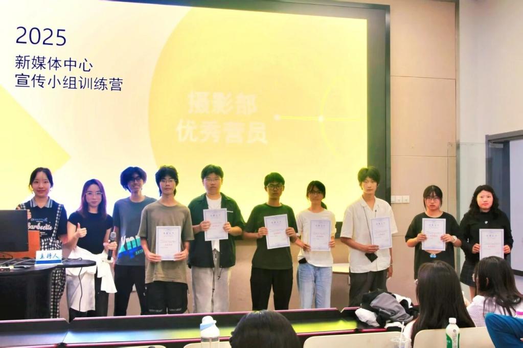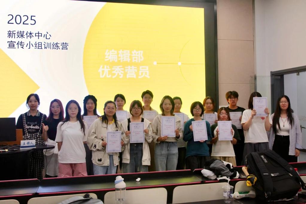 成果展示后,最令人期待的 “优秀学员表彰” 环节如期而至。新媒体中心主任、副主任与各部门部长共同上台,为经过 “作业完成度 + 课堂表现 + 作品质量” 综合评定选出的 33 名优秀学员颁发荣誉证书与奖品。其中,创意部 14 人、编辑部 12 人、摄影部 7 人,当念到名字的学员走上台时,台下响起热烈的掌声,不少人举起手机记录下这一荣耀时刻。优秀作品展示环节精彩纷呈:编辑部呈现了实训期间完成的推文作品,创意部带来了主题宣传策划与排版设计,摄影部则展出了学员们的摄影佳作。这些作品充分展现了学员们扎实的专业素养与蓬勃的创作活力。
