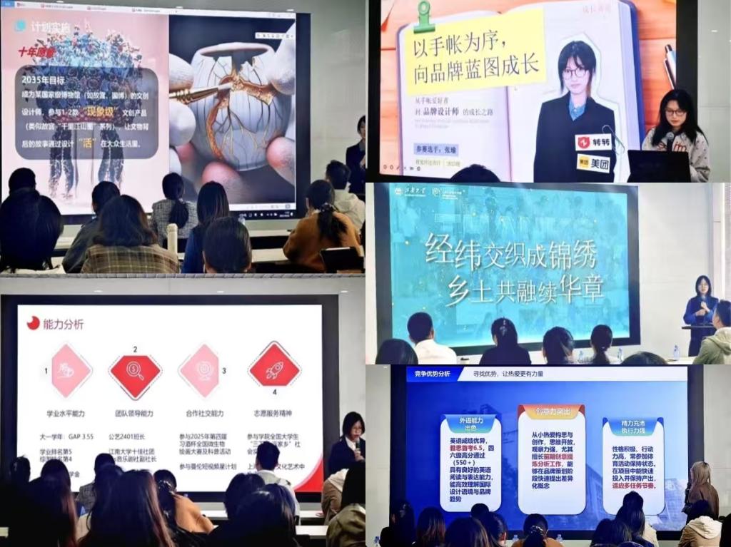 在成长赛道,陈姵文同学深耕文创设计,让文物“活”起来。聚焦文创产品策划运营设计,精研文化转译与设计落地,以十年为期,立志成为国家级博物馆设计师,推动文物故事融入大众生活。傅启华同学希望坚持初心在新媒体运营行业中就职,成为快节奏社会的一缕清风。张瑜同学立足视觉传达专业,将十年手帐练就的叙事力,与两段实习积淀的品牌思维、营销意识相融合,志在成为驱动品牌增长的战略型设计人才。 王颖同学将设计的专业与支教收获的乡土情怀融合,立志成为一名乡村规划师,用设计赋能乡土,用脚步丈量民情,绘就乡村振兴新图景。刘可岩同学立志成为一名具有战略思维的品牌设计师,专注于品牌策划与视觉系统设计。通过持续学习和实践探索品牌设计,用设计创造社会价值。