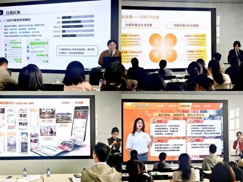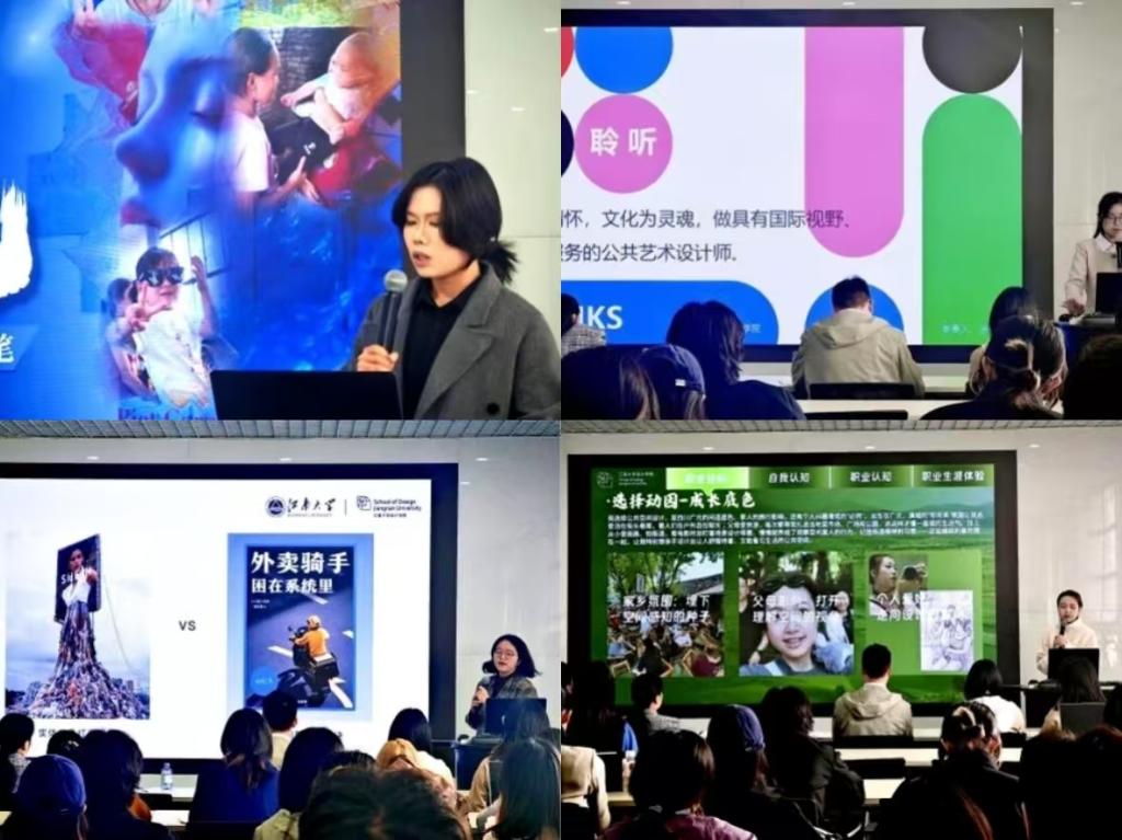 在就业赛道,朱顾雯昕同学以文为创,替物而言。立志成为一名教育型文创设计师,让传递文化的过程有温度,有深度。通过跨专业综合能力塑造新模式,让传统走向新未来。张晓雨同学以公共艺术专业为基,融合创意与公益,策划有温度、有深度的社会行动。聚焦“公益+艺术/科技”,推动项目专业化、可持续化发展,助力构建高效透明的公益生态,用行动书写时代责任。傅深铭同学以T型人才方法成长,深化专业能力、拓展跨学科知识,借乡村振兴,实习实践等多方面探索聚焦大众需求,立志成为解决复杂问题的产品经理。谭皓月同学瞄准公共空间设计,借政策机遇,以三阶段成长路径夯实能力,深耕实践,致力于设计有温度的公共空间,赋能民生与经济。