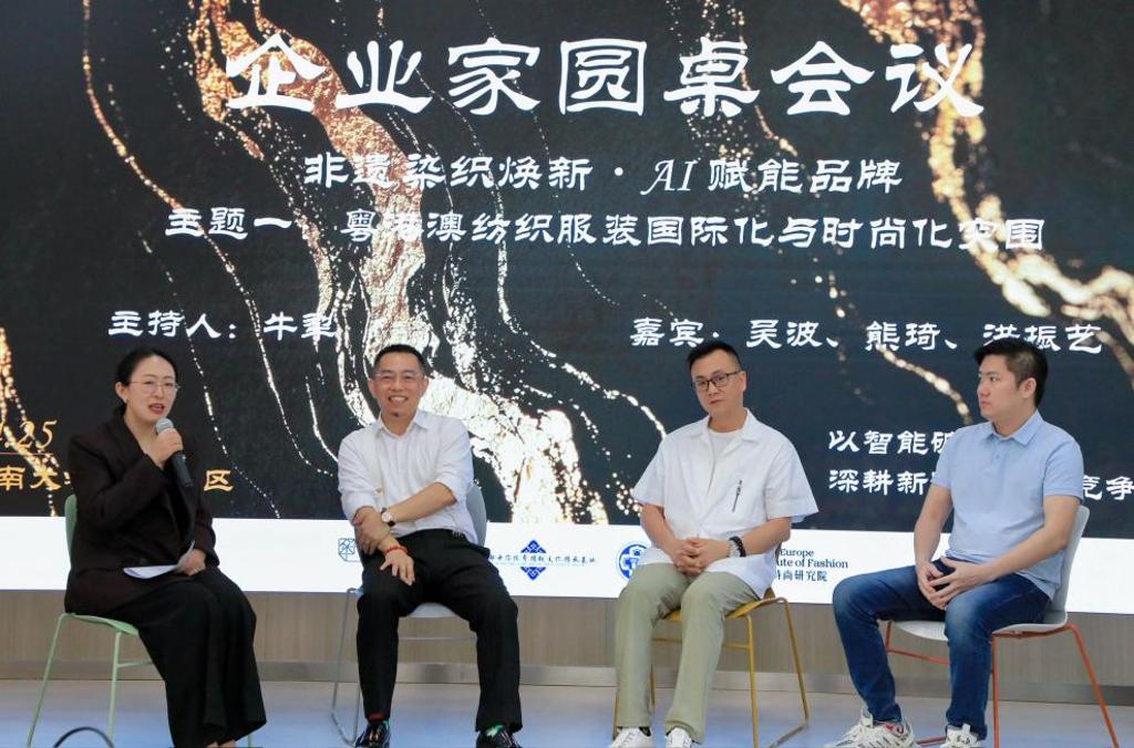 第一场圆桌以“非遗染织焕新・AI赋能品牌——珠三角纺织服装国际化与时尚化突围”为主题。三位来自珠三角大湾区的产业领袖,围绕AI赋能纺织服装品牌、非遗染织与时尚融合、品牌出海三大维度展开激烈讨论。