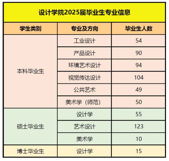 学院共设工业设计、产品设计、环境设计、视觉传达设计、公共艺术、美术学(师范)6个本科专业,以及学术型设计学硕士研究生、专业型艺术设计(MFA)研究生和学术型博士研究生。