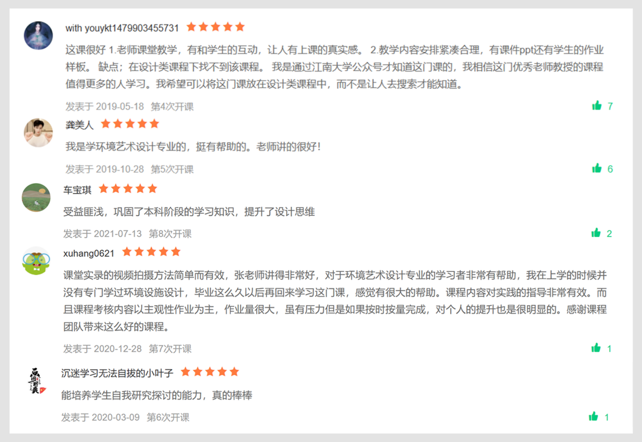 《环境设施设计》是中国大学MOOC平台的“国家精品在线开放课程”,自2017年初次开课,本次已是第十三次开课。该课程在MOOC平台口碑佳,学生满意度好,已吸引2万7千多名学生通过该平台参与本课程的学习。同时,课程作为优质慕课资源,被推荐并成功上线于“国家高等教育智慧教育平台”和“学习强国”学习平台。