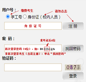 网上缴费平台”,完成缴费。考生账号已开通,切勿自行注册。收费标准:80元/生(仅申请考核考生,硕博连读考生无须缴费)。用户号在“学工号”输入正确的身份证号,初始密码(9位):“BS”+准考证编号后4位+“@fs”(准考证查看网址://yzgmis.yinghuamanga.com/zsgl/bswb/login.aspx),如“BS1234@fs”。非首次登录缴费系统的考生(含往年报考考生及误注册考生)请使用“找回密码”,登录并缴费。