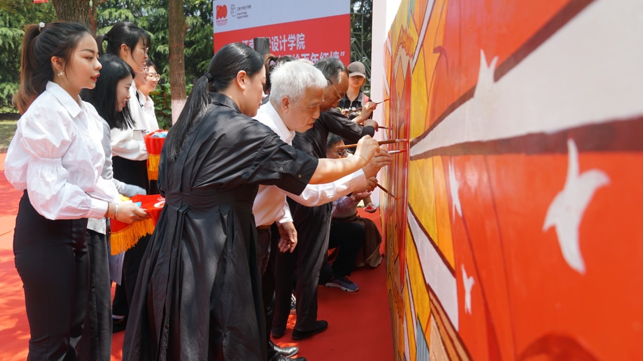 前院长、院学术委员会主任过伟敏教授、院长魏洁教授、美术与理论教工党支部书记范晓莉等7位教师代表和学生代表美术1902班班长李睿璇同学等来到红墙前,共同完成绘制百年红墙,师生携手,为百年红墙留下浓墨重彩的一笔。