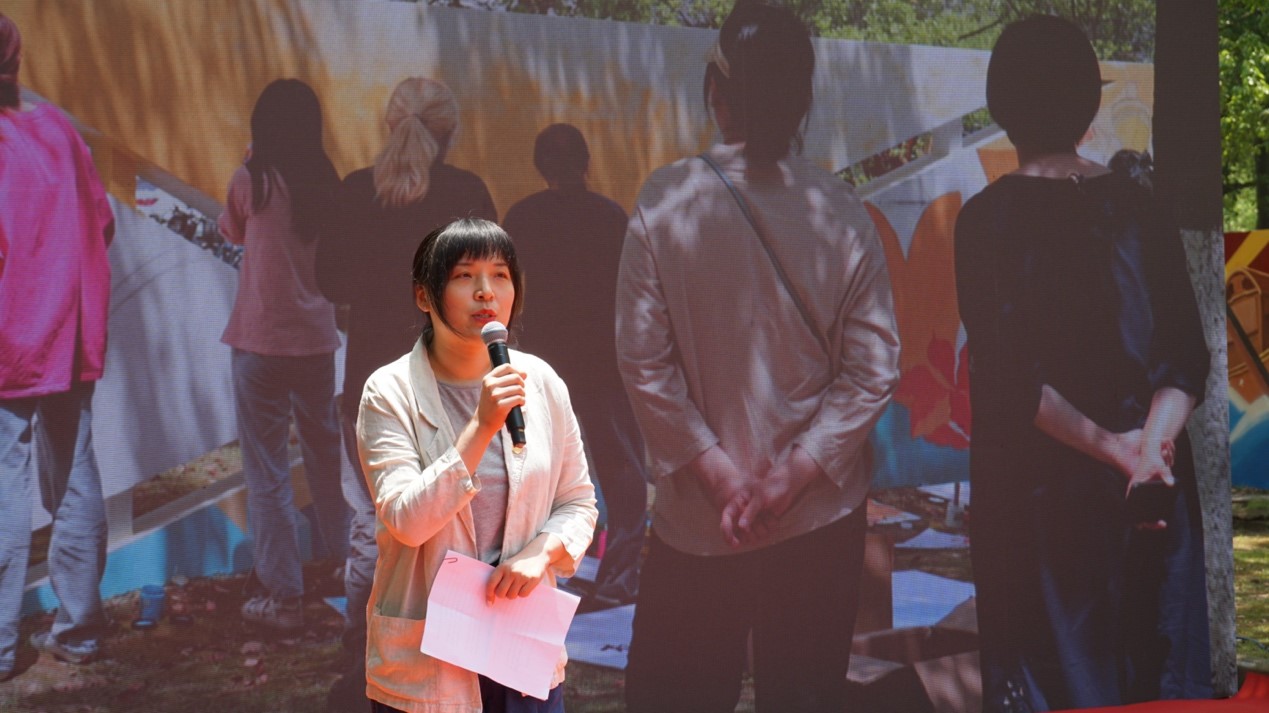 随后,墙绘设计指导老师代表,公共艺术与美术系原党支部书记徐晴副教授和视传2003班学生代表郭慧蕾同学分别进行“百年红墙”主题墙绘项目介绍,分享了“百年红墙”的创作思路和创作历程。