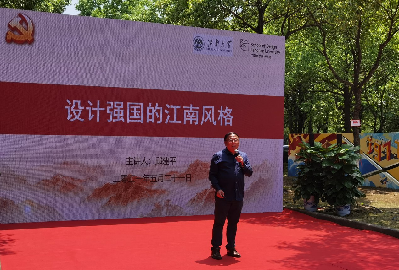 活动最后,邱建平为全体与会师生做了以《设计强国的江南风格》为主题的微党课,深入学习习近平总书记赴清华大学考察时讲话精神,发挥美术在服务经济社会发展中的重要作用,分享了老一代设计人意气风发、力争上游、拼搏进取,着力打造具有中国特色、中国风格、中国气派的设计力量,推动中国设计走向文化自信、创新卓越的奋斗故事,在“青山精神”的引领下,继往开来的“江南设计人”与时俱进,革故鼎新,时刻坚守“爱国”、“开拓”、“卓越”的理念,为中国设计注入新时代、新形势、新里程所必需的新元素。“青山精神”不驰于空想,不骛于虚声,贯彻践行“设计服务社会”的理念,为中华民族的复兴与强盛贡献蓬勃力量。