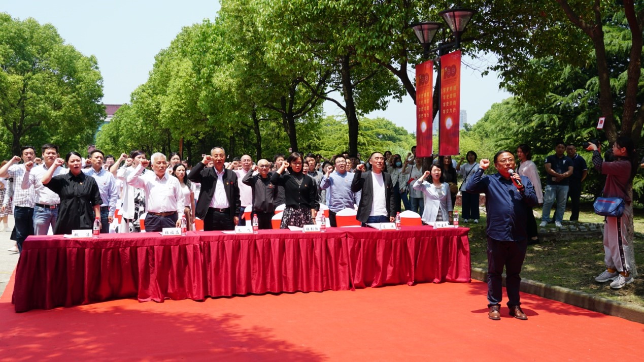 邱建平书记带领全体师生党员在党旗下重温入党誓词,重忆入党初心。