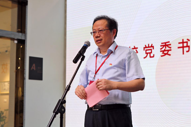 党委书记邱建平、学院副院长魏洁、教师代表视传系党支部书记代福平与朱庆葆书记一起为展览揭幕。